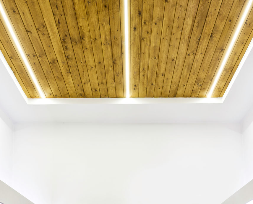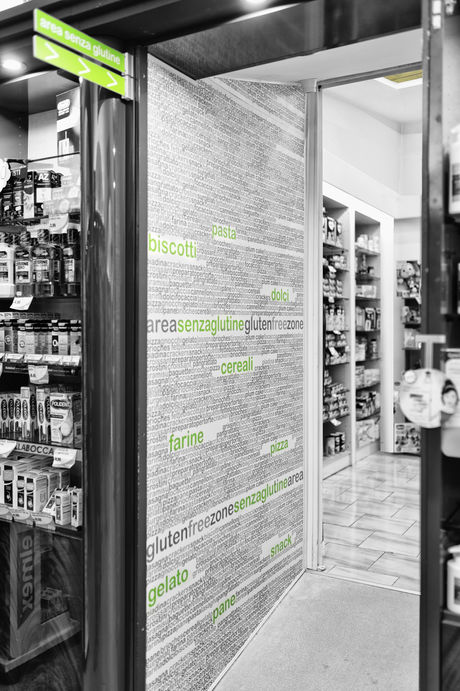 Lo spazio individuato per l’area vendita prodotti “gluten free”, all’interno della farmacia esistente, non era propriamente adeguato poichè troppo alto. E proprio la sezione irregolare ha fornito l'occasione per il disegno della controsoffittatura , costituita da vecchie tavole di legno piallate e lucidate, tre delle quali tagliate longitudinalmente da corpi illuminanti costituiti da strisce di LED a risparmio energetico. Gli arredi in legno e vetro, anch’essi recuperati, sono retroilluminati e sulle pareti di accesso all’area sono presenti delle tamponature con stampe digitali su pannelli di forex.